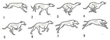 The “suspended” part of this description refers to all four of the dog’s feet being lifted from the floor and “Double” because this happens not once but twice in the stride. Once at extension (still 11) and then again when all four feet are together underneath the body (still 5-6).